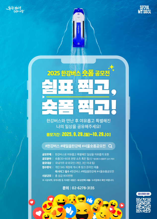 작품 출품 등 공모전 관련 자세한 내용은 2025 한강버스 숏폼 공모전 <쉼표 찍고, 숏폼 찍고!> 누리집과 <내 손안에 서울> 공모전 페이지, 또는 운영사무국(02-6278-3135)을 통해 확인 가능하다.