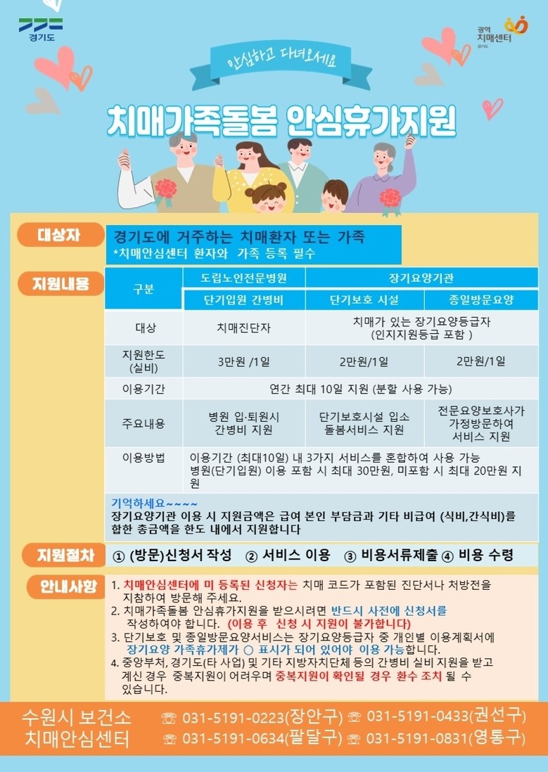 수원시 관계자는 “치매 환자 돌봄으로 지친 가족들이 잠시나마 휴식의 시간을 갖고 에너지를 재충전하길 바란다”며 “치매 환자와 가족이 안심하고 생활할 수 있는 돌봄 체계를 구축하는 데 최선을 다하겠다”고 말했다.