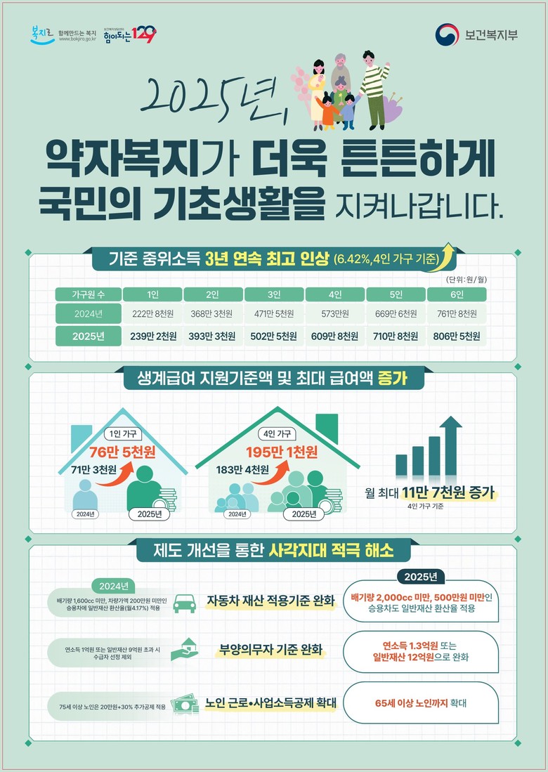 기준중위소득 인상에 따라 올해 국민기초생활보장 생계급여도 4인 가구의 경우 최대 183만 4,000원에서 195만 1,000원으로 월 11만 7,000원을 더 지원할 수 있게 된다.