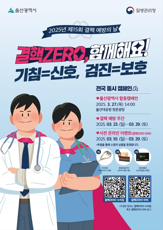 총 48개 기관 결핵예방 홍보 동참 [울산 세계타임즈=이호근 기자] 울산시는 ‘제15회 결핵예방의 날’(3월 24일)을 맞아 3월 23일(일)부터 3월 29일(토)까지 일주일간 결핵예방 홍보주간을 운영한다.