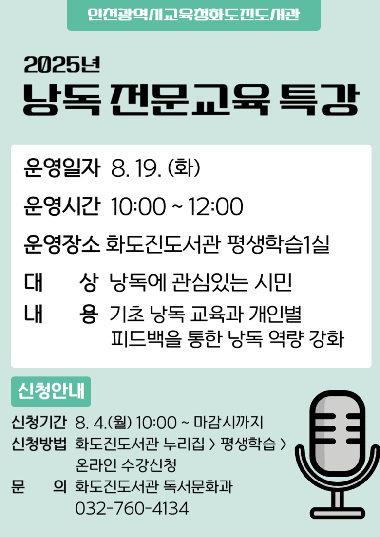 낭독에 관심 있는 시민 누구나 참여 가능하며, 교육은 8월 19일(화) 오전 10시, 평생학습1실에서 진행한다.