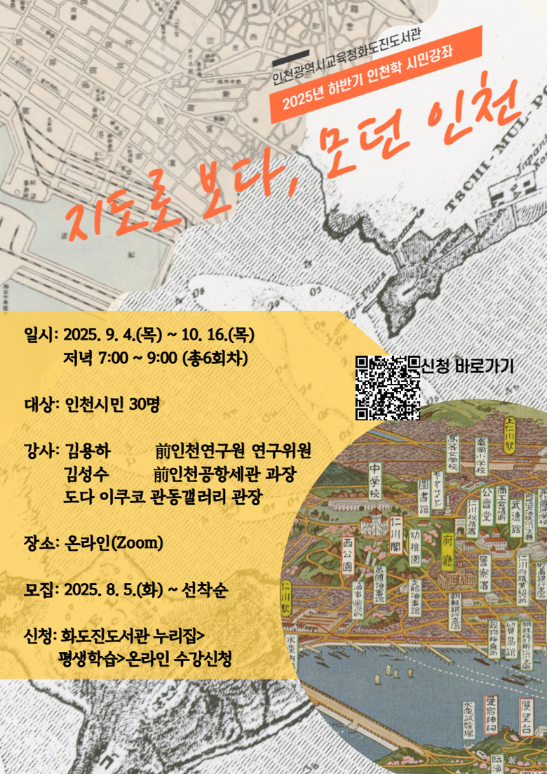 강좌는 9월 4일부터 10월 16일까지 매주 목요일 오후 7시 온라인(Zoom)으로 운영하며, 인천에 관심 있는 시민 누구나 무료로 수강할 수 있다.