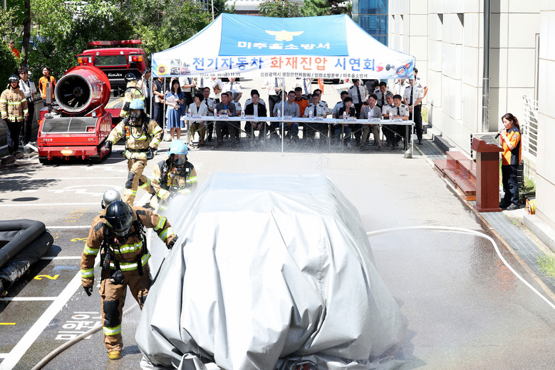 이어 소방본부 119종합상황실에서는 현황 보고를 받고 신기안전센터 진압대로부터 질식소화덮개, 이동식 수조, 상방향 방사장치, 궤도형 로봇을 이용한 전기차 화재 진압 시연을 보고 향후 발생할 수 있는 전기차 화재 예방과 대응에 만전을 기하도록 요청했다.
