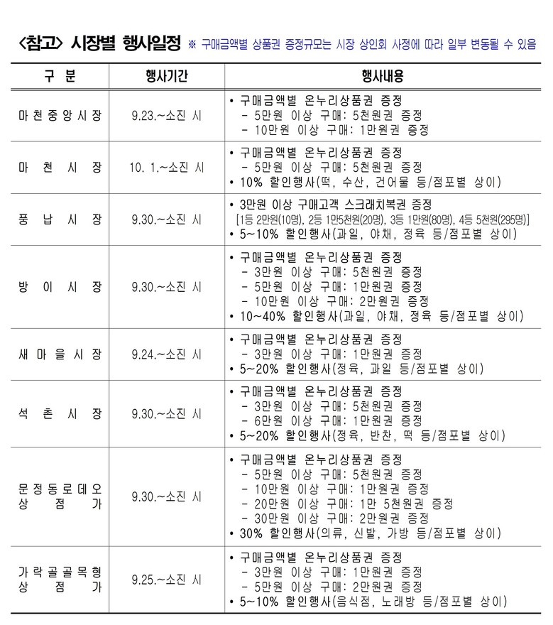 상품권 증정 행사는 별도 정해진 종료일 없이 수량 소진 시까지 진행된다. 구매 금액에 따라 최소 5천 원부터 최대 2만 원까지 증정하며, 구매 금액별 상품권 지급 금액은 시장마다 다르다.