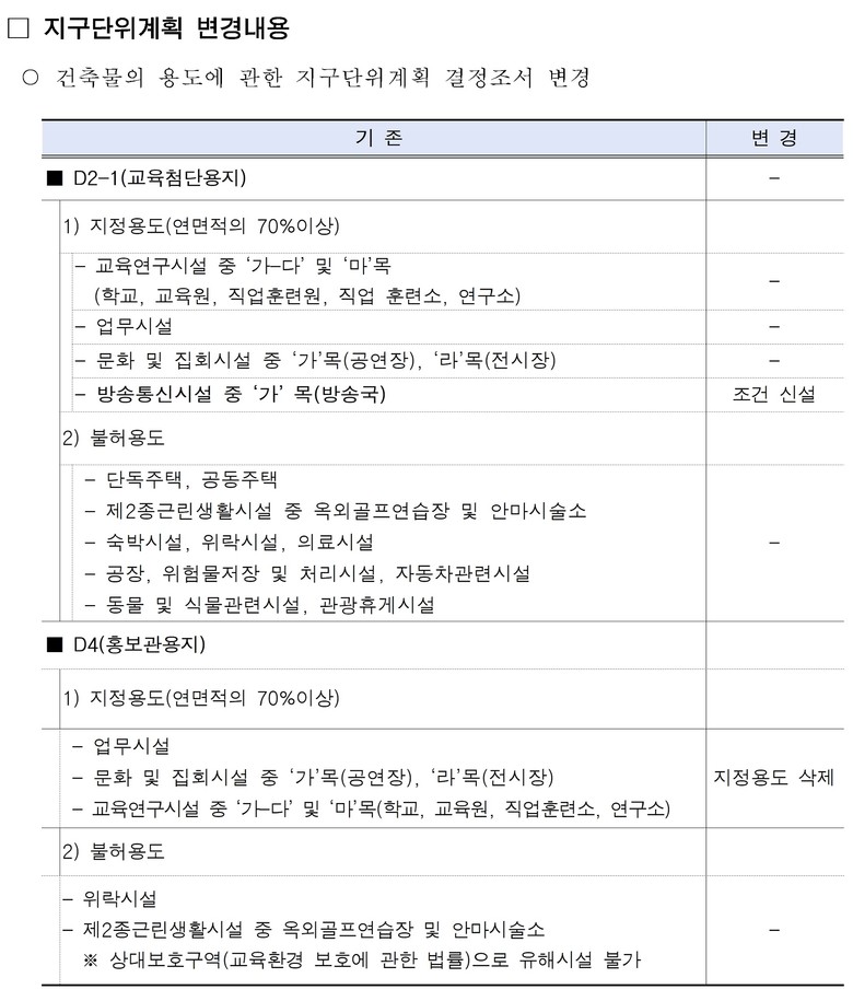 이번 변경으로 교육・첨단 부지의 지정용도에 ‘방송국’을 추가해 DMC가 국내외 콘텐츠 산업의 중심지로 도약할 수 있는 기반을 마련했다. 또한, 운영이 종료된 홍보관 부지는 불필요한 용도제한을 없애 민간의 창의적 개발을 유도한다.
