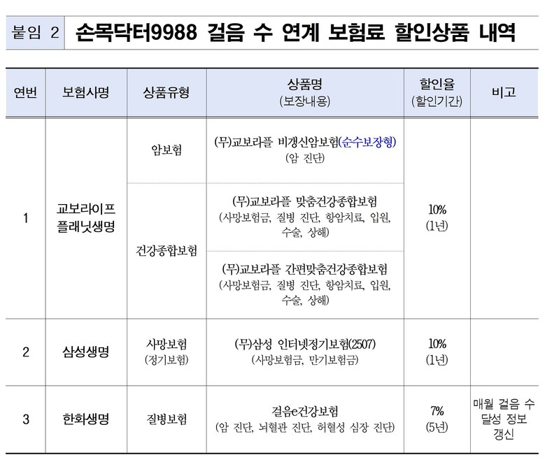 보험료 할인상품은 손목닥터9988 플랫폼에 축적된 걸음 수 데이터를 활용할 수 있는 사망, 암진단, 뇌혈관·허혈성 심장질환 진단, 입원·수술비 보장 등 주요 위험 보장이 포함된 질병보험 상품 중심이다.