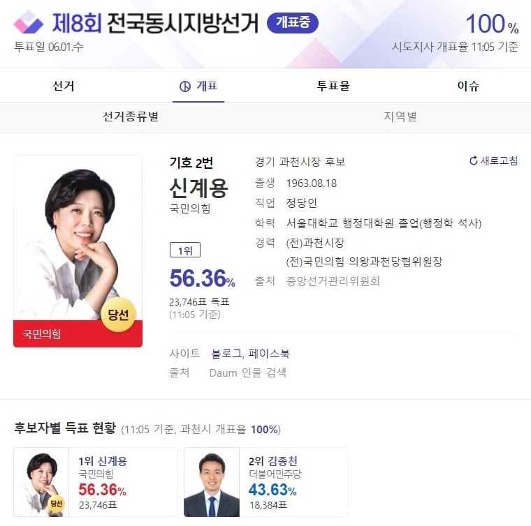 [세계타임즈 백진욱 기자] 국민의 힘 신계용 후보가 제 8회 전국동시지방선거 경기 과천시장으로 당선됐다.