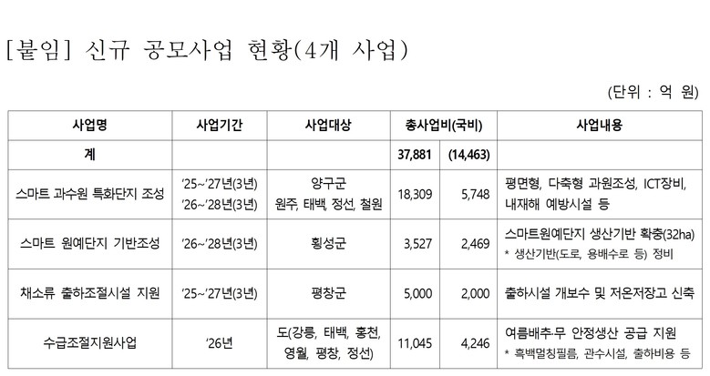 스마트원예단지 기반조성사업(횡성군)은 2026년~2028년까지 총 35억 원(국비 25억 원)이 투입돼 노후 원예시설 개보수와 스마트 시설현대화가 추진되고, 채소류 출하조절시설(평창군) 사업은 2025년~2027년까지 총 50억 원(국비 20억 원)을 들여 여름철 배추·무 출하조절을 위한 저온저장고 신축 및 기존 시설 개보수를 추진한다. 또한, 내년 신규 추진되는 수급조절지원사업은 고랭지 배추·무의 수급 조절 과정에서 발생하는 비용 일부를 지원하는 것으로 총사업비 110억 원(국비 45억 원)이 투입될 예정이다.