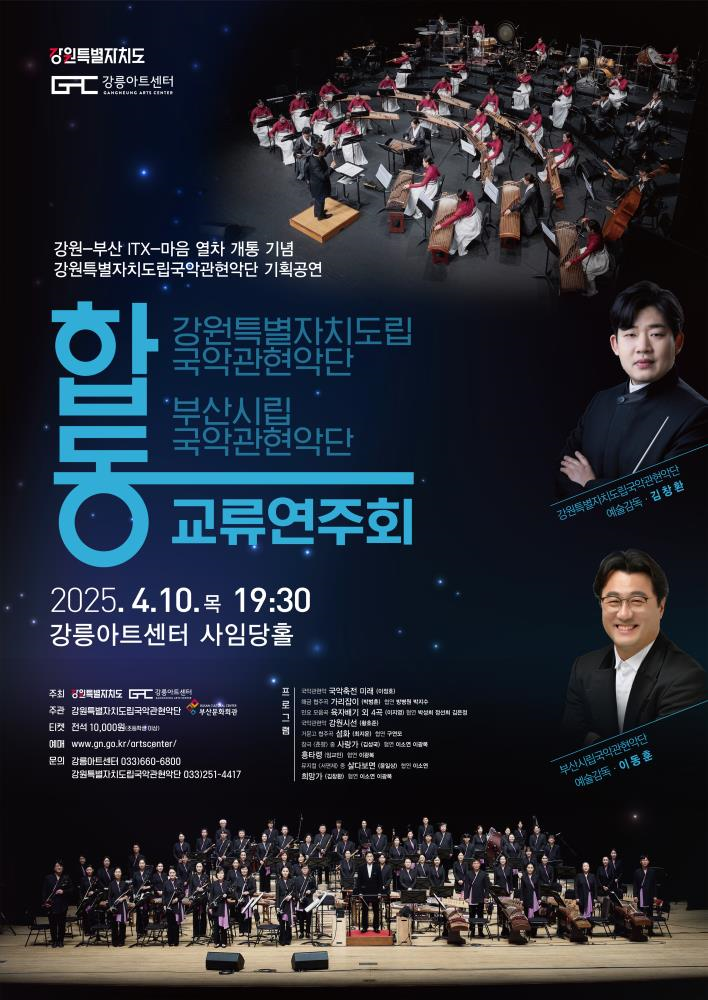 이번 연주회는 지난 1월 1일 강원-부산을 연결하는 동해선 전 구간이 개통된 것을 기념하며, 강원과 부산 두 지역을 대표하는 국악관현악단이 각 지역의 문화적 특색을 담은 곡을 포함해 전통과 현대가 어우러진 다채로운 무대를 선보이는 뜻깊은 자리다.