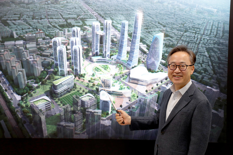 | ▲ 유성훈 금천구청장이 공군부대 개발 조감도를 설명하고 있다 |