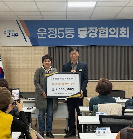 이창훈 운정5동장은 “통장협의회의 꾸준한 나눔 실천이 지역사회를 더욱 따뜻하게 만들고 있다”라며 “기탁된 성금은 겨울철 어려움을 겪는 가구에 온기를 전하는 데 도움이 되도록 하겠다”라고 전했다.