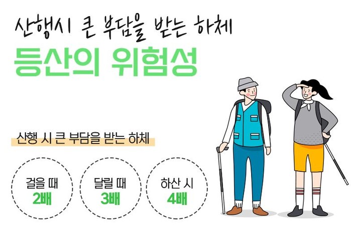 그러나 이렇게 이로운 등산에도 유의할 점이 있다. 바로 부상이다. 특히 등산은 발과 무릎 등에 부담을 준다. 하체는 평소 걸을 때 약 2배의 하중을 받고 달릴 때는 그 하중이 3배로 늘어난다. 등산을 하게 되면 우리 무릎과 발이 받는 하중은 4배까지 늘어나게 된다.