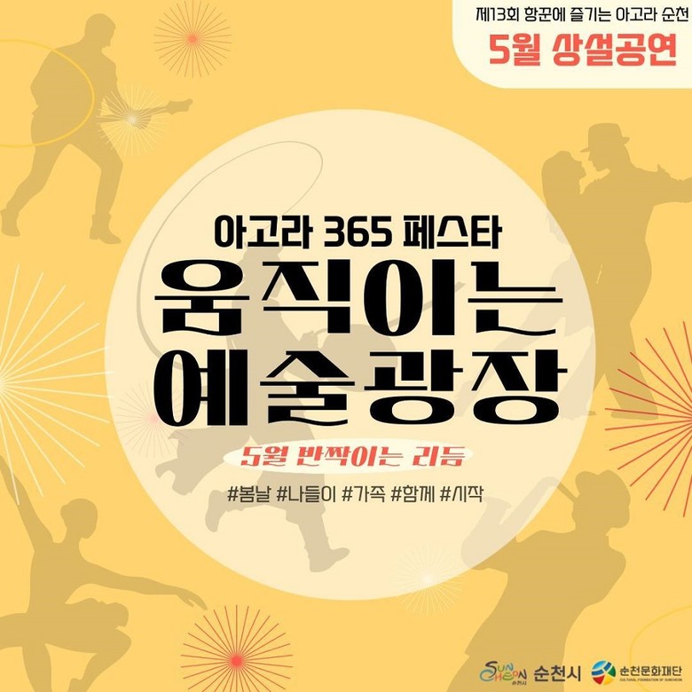 이번 5월에는‘반짝이는 리듬’이라는 주제에 맞춰 총 5개 장르(▲국악 ▲대중음악 ▲다원예술 ▲무용·댄스 ▲양악)의 공연팀들이 시민들과 순천을 찾는 관광객을 대상으로 순천시 곳곳에서 다채로운 공연을 선보일 예정이다.