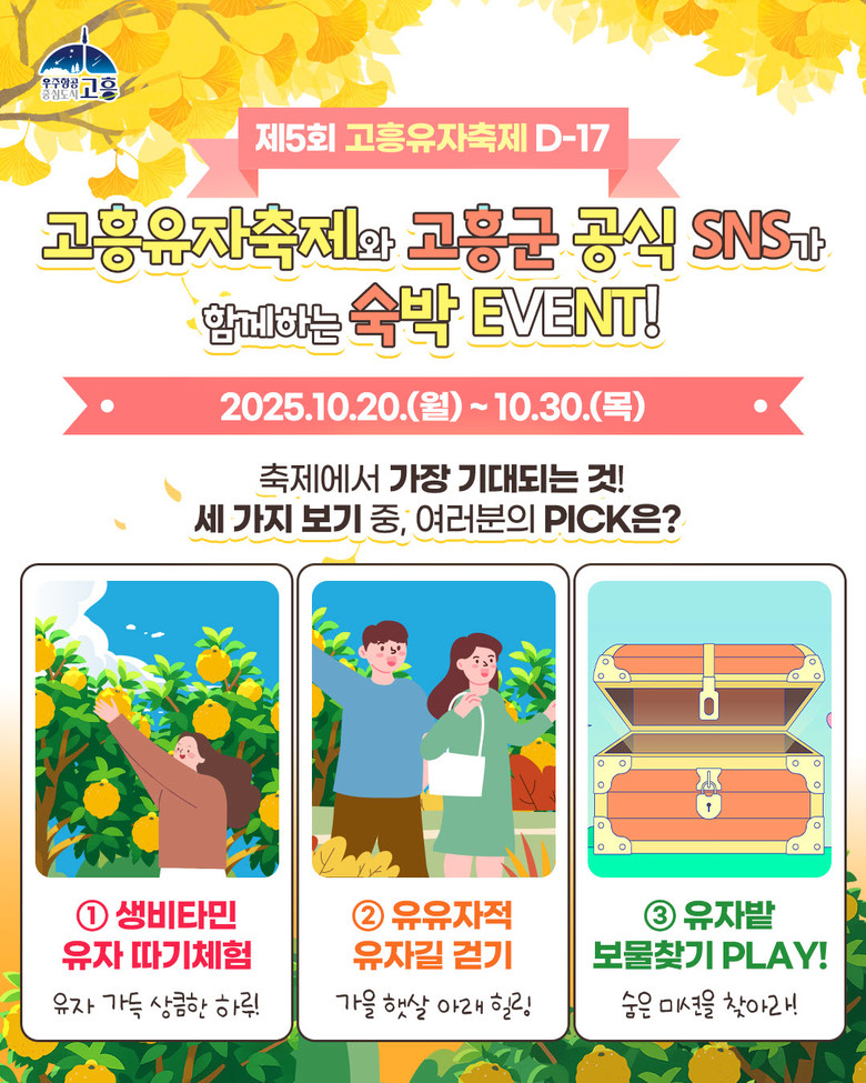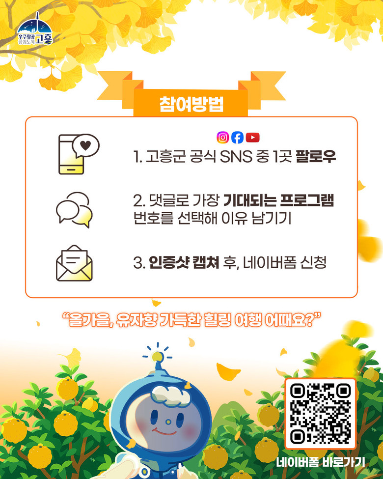 이벤트 참여 방법은 ①고흥군 공식 SNS(인스타그램, 페이스북, 유튜브) 중 1곳을 팔로우하고 ② 본 게시글 댓글에 제5회 고흥유자축제에서 가장 기대되는 프로그램 번호를 선택해 이유를 남긴 후 ③ 인증샷을 캡처 후, 네이버 폼 링크 이벤트 페이지에 접속해 간단한 신청서를 작성하면 된다.