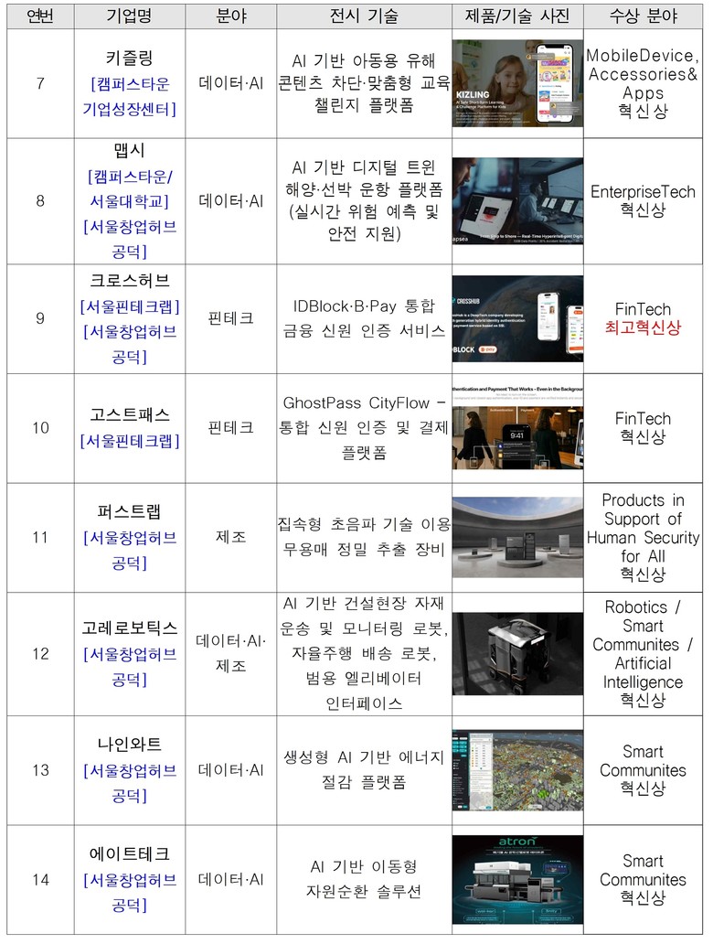 이처럼 서울창업허브는 해양·로봇·모빌리티 등 기술기업이 스케일업할 수 있도록 분야별 특화 지원을 제공하며, CES에서 연속적인 성과를 내는 기반이 되고 있다.
