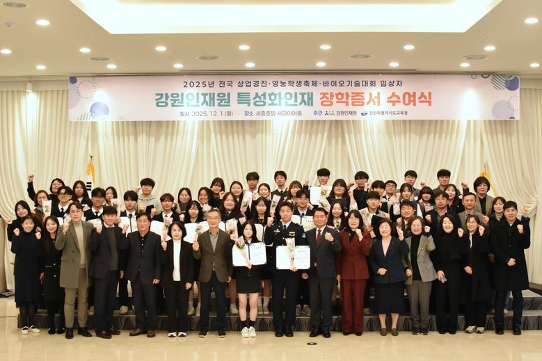[강원도 세계타임즈=김민석 기자] 강원인재원(원장 김학철)은 12월 1일(월) 11시, 춘천 세종호텔 사파이어홀에서 올해 치뤄진 전국 고교생 상업경진대회·영농학생축제·바이오기술경진대회에서 입상한 강원특별자치도 특성화인재 70명에 대한 장학증서 수여식을 개최했다고 밝혔다.