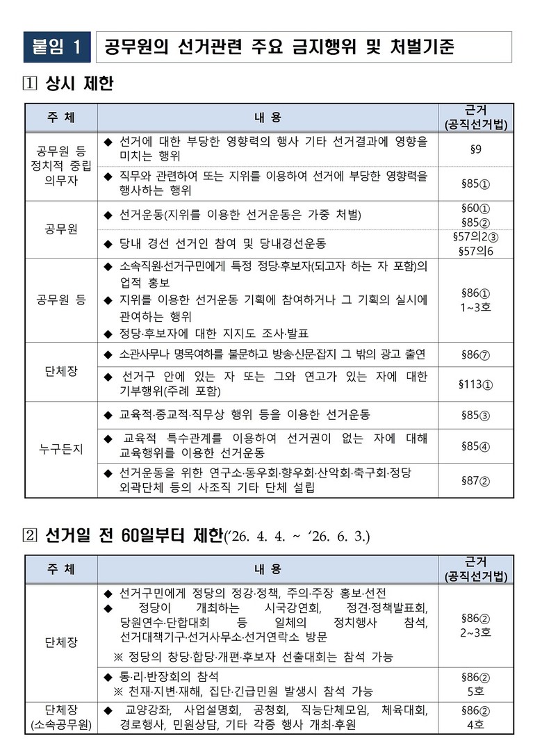특히 공직자가 사회관계망서비스(SNS)를 통해 선거에 영향을 미치는 행위와 주요 선거법 위반 사례를 전파해 유사 사례가 발생하지 않도록 예방 활동도 병행할 방침이다.