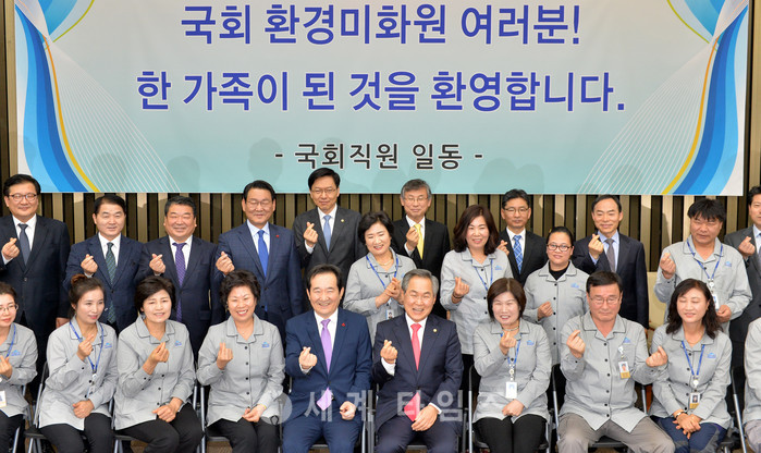 정세균(앞줄 왼쪽 다섯번째부터) 국회의장과 우윤근 국회 사무총장 등이 2일 오전 서울 여의도 국회 제4회의장에서 열린 청소근로자 직접고용 기념 신년행사에 참석해 환경미화 직원들과 기념촬영을 하고 있다. 2017.01.02.