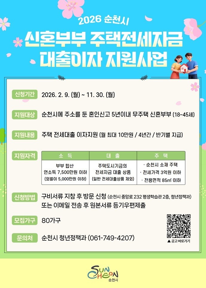 신혼부부 주택전세자금 대출이자 지원사업은 순천시에 거주하는 무주택 신혼부부에게 전세자금 대출이자를 월 10만 원씩 최대 4년간 지원하는 사업이다.