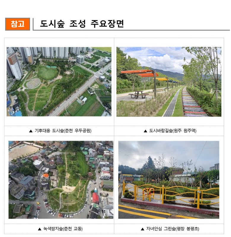 이와 함께, 아름다운 도시경관 창출과 도시숲을 연결하는 ‘가로수’, 생활권 인접 지역 환경 개선과 휴식공간 제공을 위한 ‘생활환경숲’, 도시 내·외곽에 방치되어 있는 유휴지 또는 도시 내 산림을 활용한 ‘산림공원’ 등 다양한 유형의 소규모 녹지를 추가해 도시 미관을 개선하고 녹지 네트워크를 확장한다.