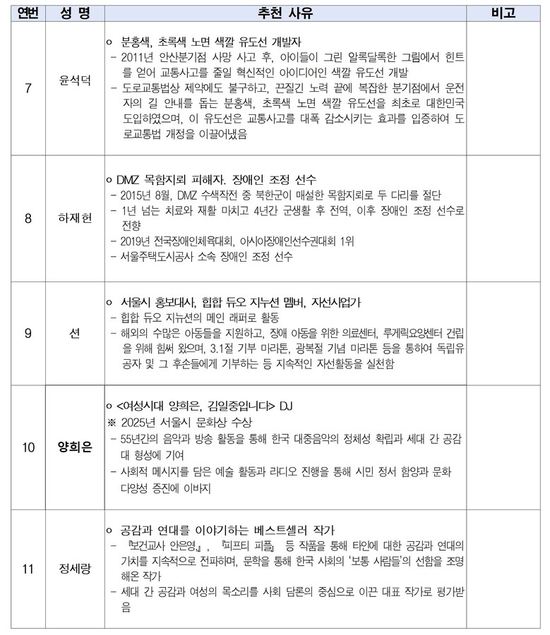 또한 ‘지속적인 자선활동으로 선한 영향력을 끼치는’ 션과 ‘한국 대중음악의 산증인’ 가수 양희은 씨, ‘공감과 연대에 대해 이야기하는’ 작가 정세랑 씨도 타종인사로 선정됐다. .※ 타종인사 추천사유 붙임 1 참조