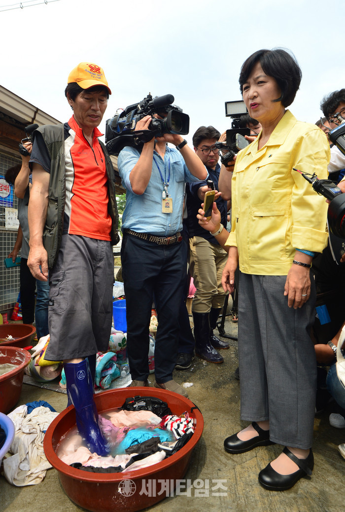 추미애 더불어민주당 대표가 21일 오전 충북 청주시 흥덕구 송절동 인근 수해 현장을 찾아 자원봉사자와 대화하고 있다. 2017.07.21.