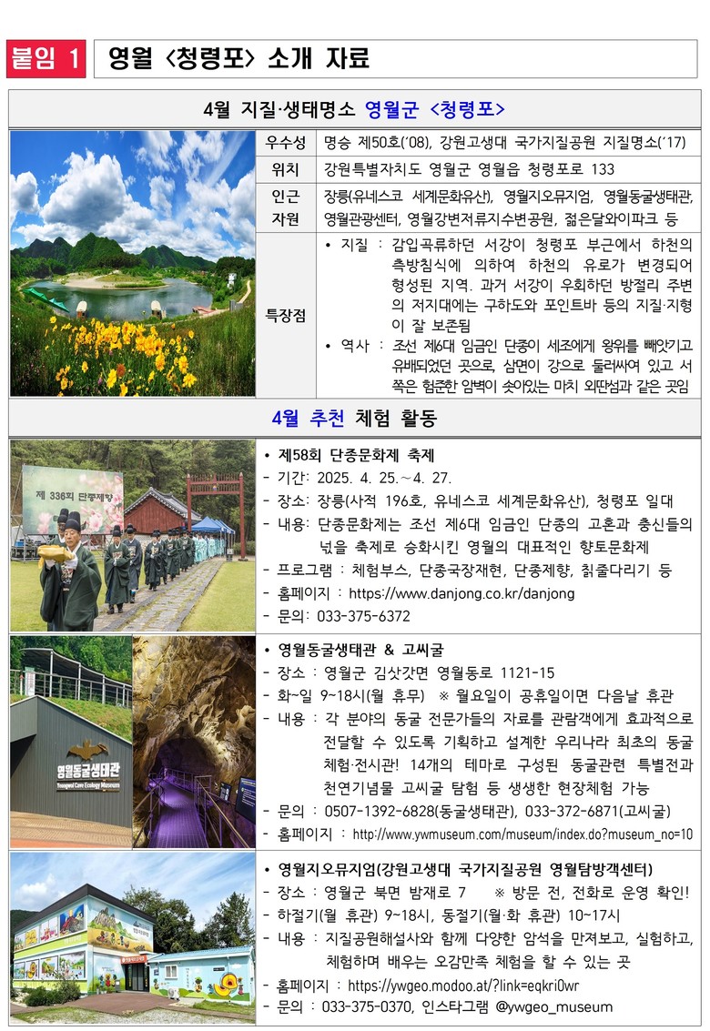 한편, 오는 4월 25일부터 27일까지는 단종의 넋과 충신들의 충절을 기리는 영월의 대표 향토문화제인 ‘제58회 단종문화제’가 청령포와 장릉 일대에서 개최된다. 축제 기간에는 강원고생대 국가지질공원 홍보·체험 부스도 함께 운영되어 청령포를 포함한 영월의 지질자원과 역사적 가치를 더욱 깊이 있게 체험할 수 있다.