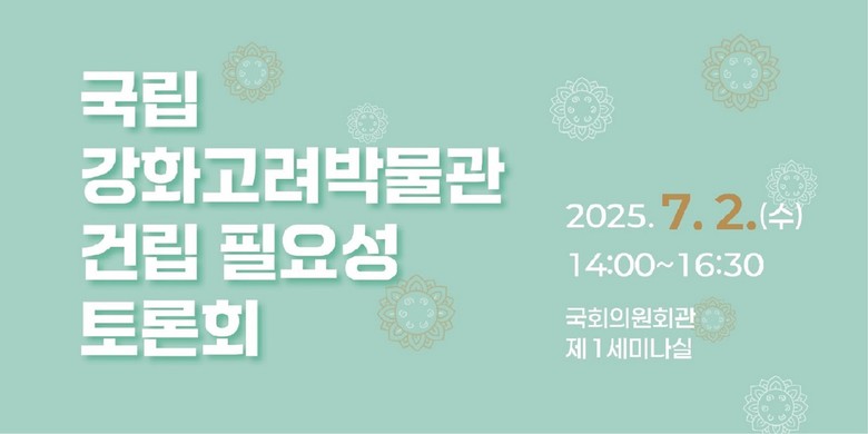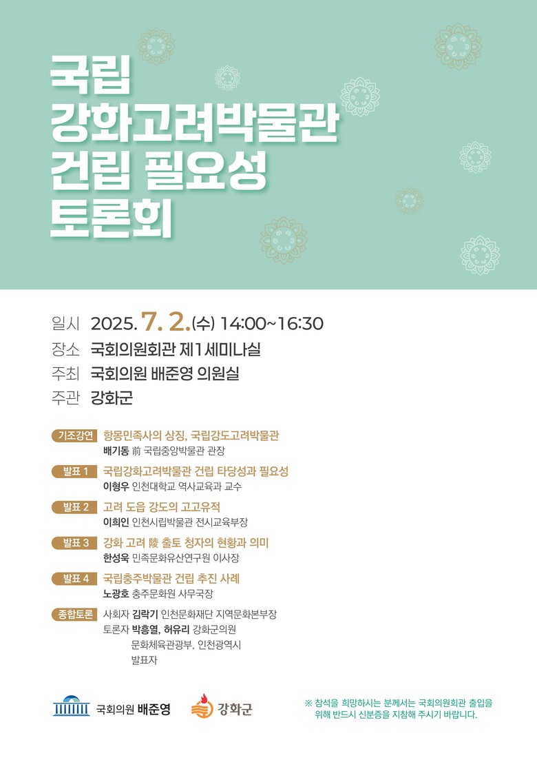 [강화군 세계타임즈=심하린 기자] 강화군(군수 박용철)은 국회의원 배준영 의원실과 함께 오는 7월 2일(화) 오후 2시 국회의원회관 제1세미나실에서 ‘국립강화고려박물관 건립 필요성 토론회’를 개최한다고 밝혔다.