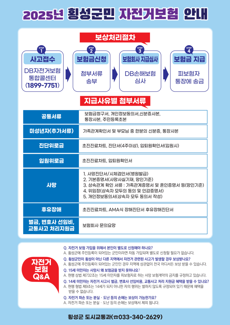 횡성군에 주민등록을 둔 군민이라면 지역에 상관없이 전국 어디서든 자전거 사고에 대해 보장받을 수 있다.