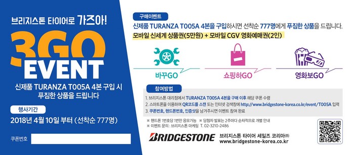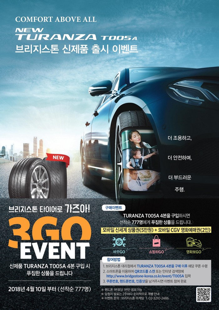 [세계타임즈 이영진 기자] 타이어 기업 브리지스톤의 한국법인 브리지스톤 타이어 세일즈 코리아(이하 브리지스톤)가 프리미엄 고성능 타이어인 투란자 T005A를 국내 시장에 출시했다. 투란자 T005A는 비행기 1등석에서 느끼는 안락함과 같이 정숙하면서 부드러운 승차감을 제공하고 안전성에서도 우수한 성능을 발휘하는 타이어다. 브리지스톤은 투란자 T005A 출시 기념으로 해당 타이어를 구매하는 고객 선착순 777명에게 다양한 상품을 증정하는 이벤트도 연다.