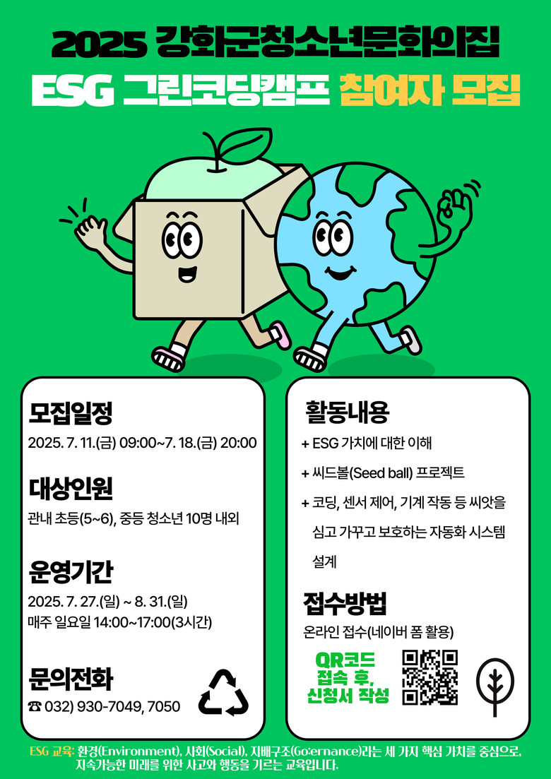 환경․사회․지배구조 세 가지 핵심 가치에 대한 이해력 키워 [강화군 세계타임즈=심하린 기자] 강화군시설관리공단(이사장 박영길) 청소년 문화의 집은 오는 11일~18일까지 관내 초등(5~6학년) 및 중등 청소년을 대상으로 ESG 그린코딩캠프 참가자를 모집한다고 밝혔다.
