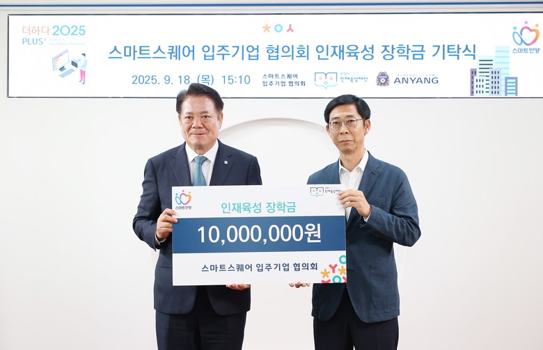 최대호 이사장은 “스마트스퀘어 입주기업 협의회의 따뜻한 나눔에 깊이 감사드린다. 기탁해주신 소중한 장학금이 우리 지역 학생들에게 큰 힘과 격려가 될 수 있도록 공정하고 투명하게 전달하겠다”고 밝혔다.