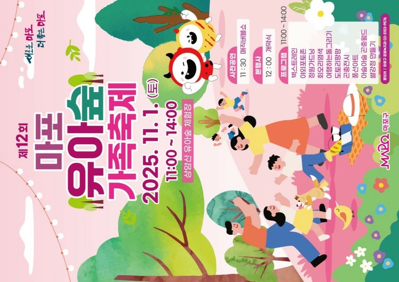 - 현장 접수 병행으로 가족 단위 참여 기회 확대 [마포구 세계타임즈=이장성 기자] 마포구(구청장 박강수)는 아이들과 가족이 함께 도심 속에서 자연을 즐길 수 있는 ‘제12회 유아숲 가족축제’를 오는 11월 1일(토) 상암근린공원 내 유아숲체험원에서 개최한다.