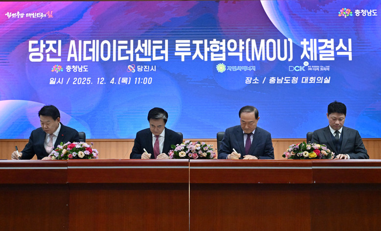 김태흠 지사는 4일 도청 대회의실에서 오성환 당진시장, 안병철 지엔씨에너지 대표이사, 정영훈 디씨코리아 대표이사와 당진 AI데이터센터 건립을 위한 투자협약(MOU)을 체결했다.