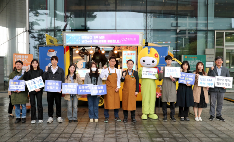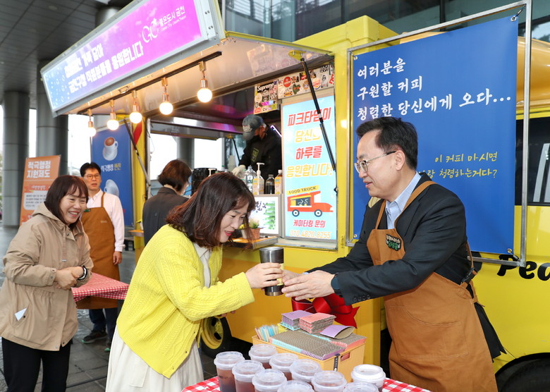 이날 아침 유성훈 금천구청장은 ‘금천 청렴 커피차’에서 1일 바리스타로 변신해 앞치마를 두르고 출근하는 직원들에게 직접 커피를 나눠주며 격려했다.