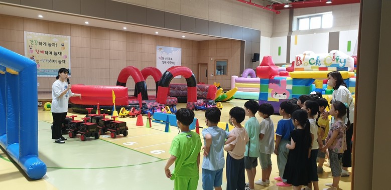 6월 20일부터 4일간 운영한 「신체활동 Day」는 유아가 대근육 활동을 마음껏 할 수 있도록 ▲초대형 에어바운스 ▲스피드 자동차 ▲돌아가는 팽이의자 등 총 7종의 놀이시설을 설치하고 안전을 위하여 회차당 한 학급씩 이용하였다. 활동 시 학부모회에서 안전 도우미를 지원하여 유아가 더욱 안전하고 신나는 놀이기구 체험을 할 수 있었다.