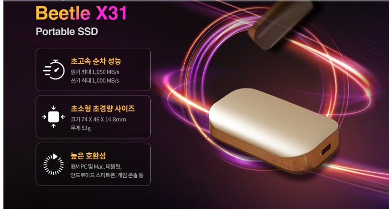 X31은 한 손에 쏙 들어오는 크기와 이름과 같이 딱정벌레를 연상시키는 디자인으로도 눈길을 끈다. 특히 53g의 초경량, 74 X 46 X 14.8mm의 초소형 사이즈로 휴대에 최적화되었으며, 공학적 설계가 반영된 알루미늄 바디와 둥글고 매끈한 엣지가 그립감을 더했다. 그뿐만 아니라 IBM PC 및 Mac, 태블릿, 안드로이드 기반 스마트폰, 게임 콘솔 등 다양한 장치와 호환된다. 용량은 512GB, 1TB 두 가지 종류로 출시되었으며, USB 연결 케이블 2종(C-to-C, C-to-A)과 함께 전용 범퍼케이스가 기본으로 제공된다.