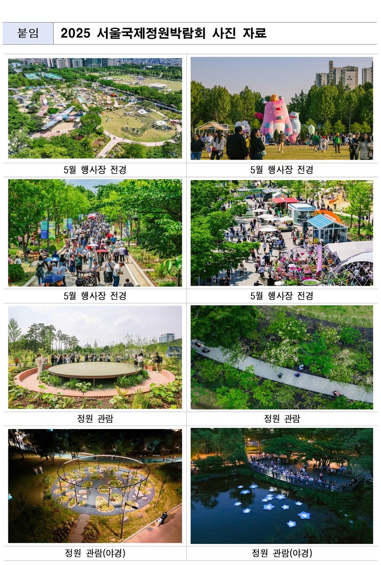 보라매공원 방문객 수는 박람회가 열리기 전인 지난해 동기간보다 2.6배 증가했고, 특히 개막 첫 2주(5. 22.~6. 4.)는 지난해 대비 5배 이상(413% 증가)의 방문객을 기록했다.