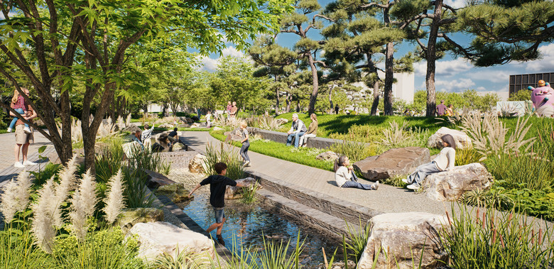 또한, 소나무 숲을 중심으로 한 ‘송현산마루 숲’, ‘솔담채 언덕’을 조성해 과거 송현의 소나무 언덕을 현대적으로 구현하고, 차경(借景) 개념을 적용한 ‘차경 파고라’, 물길과 수변 식생이 어우러진 ‘송현물길’, 다양한 그늘 쉼터 등 다양한 휴게공간을 마련해 단순 통과형 공간이 아닌 머무는 공간으로 계획하였다.