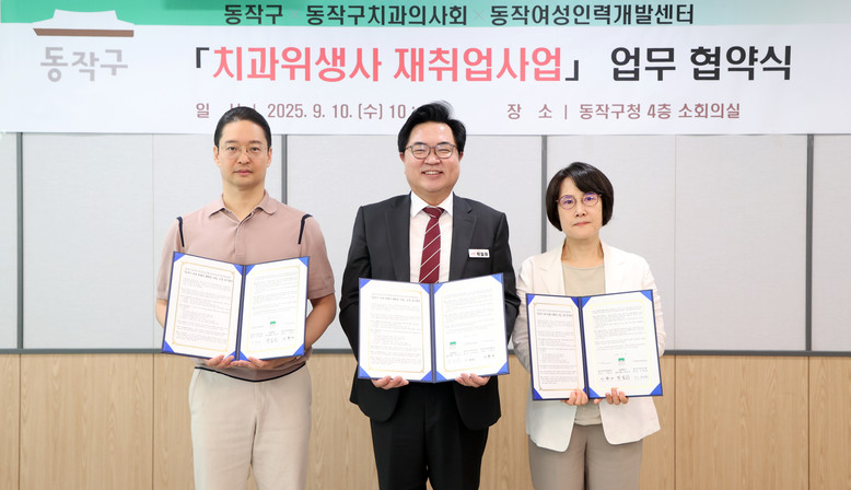 이날 협약식에는 박일하 동작구청장을 비롯해 이태희 동작구치과의사회회장, 이현아 동작여성인력개발센터 관장 등이 참석해 치과위생사 재취업 지원에 적극 협력하기로 뜻을 모았다.