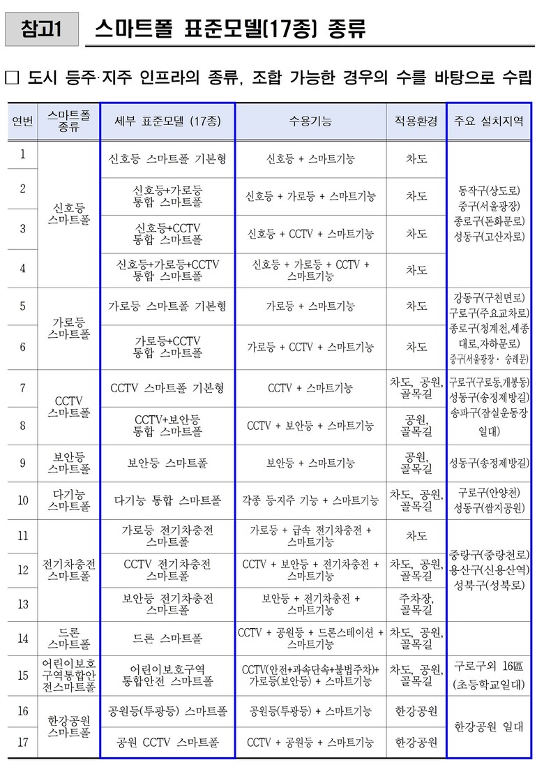 현재 시가 운영하고 있는 총 17개 유형 중 ‘CCTV+보안등’ 통합형 스마트폴이 259개(25.9%)로 가장 많은 비중을 차지한다.