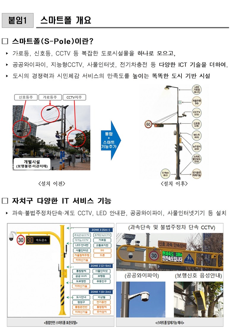 또 기존에 CCTV.신호등.가로등 등을 각각 설치하던 방식과 달리 여러 시설물을 하나의 지주로 통합하면서 전력.통신 인입공사 통합, 기초.배선 공정 축소, 중복 설치된 시설물 제거 등으로 평균 23%의 시설물 설치비도 절감된 것으로 나타났다.