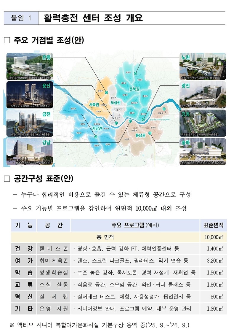 시니어 여가 허브 역할을 할 ‘활력충전 센터’는 2027년 G밸리 교학사 부지(금천구) 1호점 착공을 시작으로 2032년까지 도심·동북·서북·서남·동남 등 주요 권역에서 총 8개소를 단계적으로 확충 예정이다. 아울러 지역 특성과 여건을 반영해 세부 입지와 규모, 도입 기능을 조정하고, 재원·사업방식(공공기여, 복합개발 등)도 검토한다.