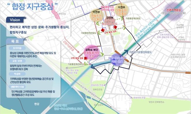 ○ 합정 지구중심(마포구) : 중심성 강화를 위해 간선도로변 복합개발을 유도하고, 지역특성을 반영한 청년문화예술 공간조성 및 근린상권 활성화 유도를 제시하고 있다.
