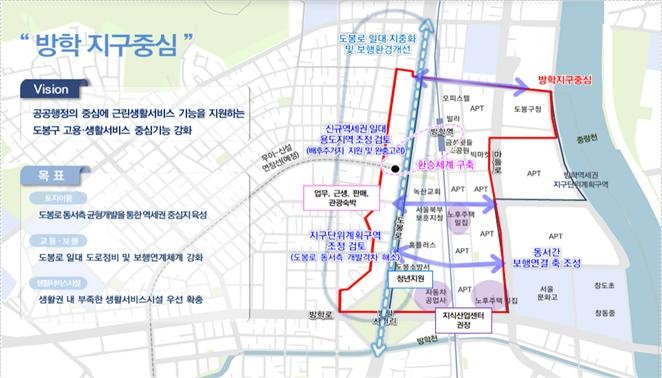 ○ 방학 지구중심(도봉구) : 방학 역세권 지구단위계획 재정비와 연계해 우이~신설 연장선 경전철을 고려한 용도지역, 지구단위계획구역 등의 조정을 검토하고, 도봉로변에 상업·업무·관광숙박 등 육성용도를 도입해 동·서간의 개발격차를 해소하고 가로활성화 유도를 제시하고 있다.
