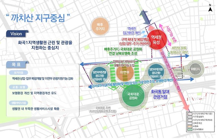 ○ 까치산 지구중심(강서구) : 지구단위계획 재정비를 통해 역세권 상업·업무 복합개발을 유도하고 이면부 관광지원기능을 강화해 생활권 내 부족한 시설을 확충하고, 근린 및 관광을 지원하는 중심지 조성을 제시하고 있다.
