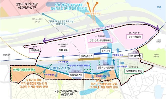 ○ 노량진 지구중심(동작구) : 상업·관광 및 교육·수변문화 거점 조성을 위한 육성용도를 도입하고 도심 연결 교통체계 및 한강·여의도 보행 접근성을 개선해 영등포·여의도 도심기능 지원을 제시하고 있다.