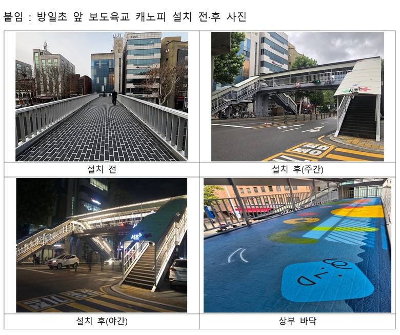 초등학생들의 주요 통학로인 방일초 앞 보도육교는 비나 눈이 오는 날에는 보행 중 미끄러질 우려가 있어 시설물 개선 요구가 이어졌다. 이에 지난 1월 방배1동 주민들과 방일초 학부모회 등을 대상으로 보도육교 캐노피 설치 찬반 설문조사를 진행했고, 참여자 중 90%가 캐노피 설치에 찬성하며 본격적으로 사업이 추진됐다.