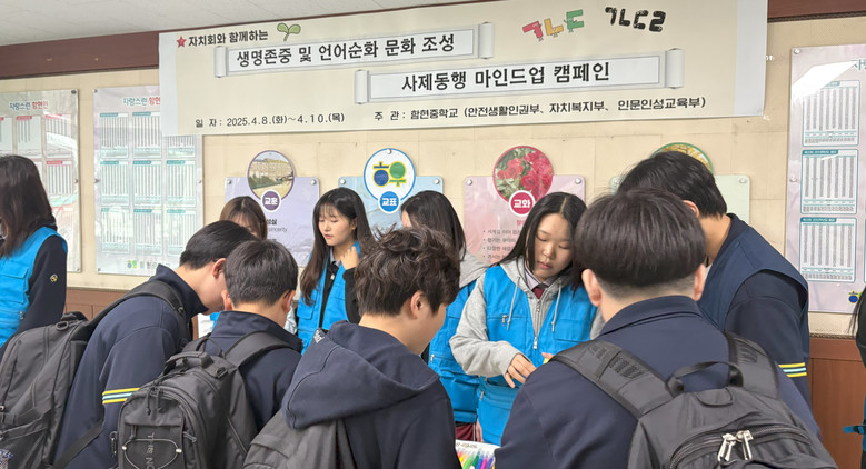 [시흥시 세계타임즈=송민수 기자] 함현중학교(교장 엄태헌)는 학생자치회와 함께 지난 8일(화)부터 3일간 ‘생명 존중, ‘언어 순화’, ‘사제동행’을 주제로 연속 캠페인을 진행했다. 이번 캠페인은 학생 자치 문화의 활성화와 더불어 학생들의 생명 존중 의식 함양, 언어 사용 개선, 그리고 교사-학생 간의 유대 강화라는 의미 있는 목표를 담고 있다.