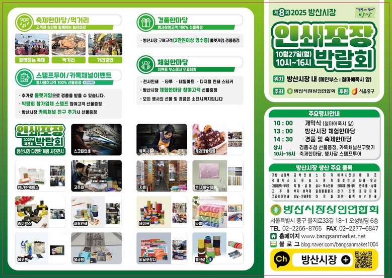 특히 스탬프 투어형 전시·홍보 부스에는 14개 점포가 참여해 방문객을 맞이한다. 방문객은 점포를 방문해 PE·PP 케이스, 종이박스, 테이프, 비닐포장지, 벽지·바닥재, 인쇄 지류 등 방산시장의 대표 품목을 살펴보고 설명도 들을 수 있다. 스탬프 투어에 참가하면 소정의 기념 선물이 증정된다.